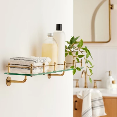 Keep your house neat and organized with this Decorative Glass Wall Shelf with Brass Rail from Hearth & Hand™ with Magnolia. This wall shelf features an open design with a tempered glass base, making it a great pick for organizing hand towels, shampoo or body wash bottles, as well as other cosmetics, photos and more. Featuring a metal rail in brass finish, it’s sure to add a touch of style to any wall in your house.