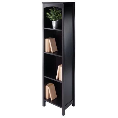 Provide your home with a functional storage space with the Terrace 4-Shelf Bookshelf from Winsome. Featuring four spacious shelves to tuck away your journals, novels, decorative figurines or family photographs, this four-tier bookshelf makes a functional and stylish piece. Decorated with a classic espresso finish with slightly arched details under the tabletop, this vertical bookcase brings a traditional flair to your space. This 5-Tier Shelf has overall size of 14.5″W x 11.8″W x 56″H. Top is 14.49″W x 11.81″D. Top shelf is 12.05″W x 10.63″D x 12.80″H and all other shelves is 12.32″H.