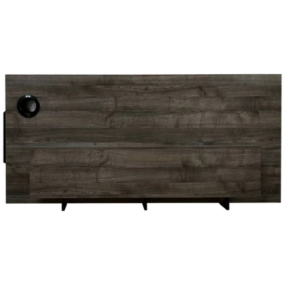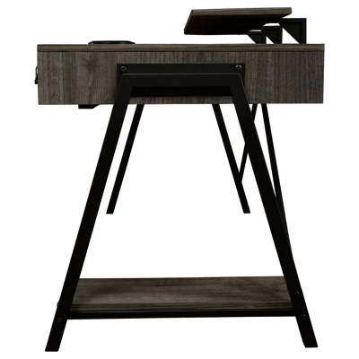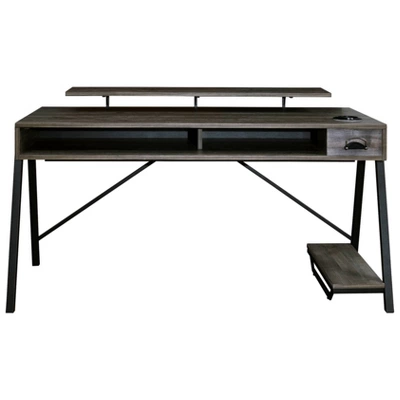 Elevate your style and up your game with the ultra-cool Barolli gaming desk. Clean and contemporary, this mixed media designer desk includes a metal frame in silvertone finish, topped with an engineered wood surface with replicated wood grain. Setting you up for success: a large open raceway for power cord management, desk top monitor shelf and an LED back light with multiple color options for an enhanced gaming experience. Along with a PC stand for easy access, this gaming desk features a custom designed headset hanger and a built-in electric can cooler with USB plug-in. Signature Design by Ashley is a registered trademark of Ashley Furniture Industries, Inc.