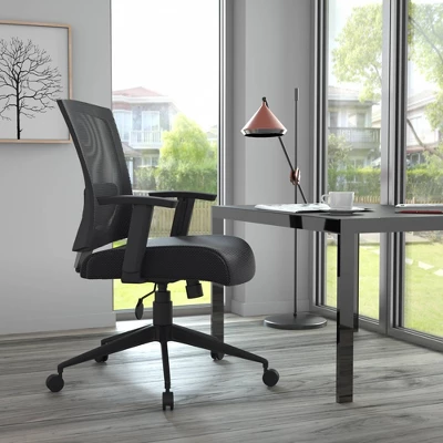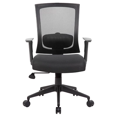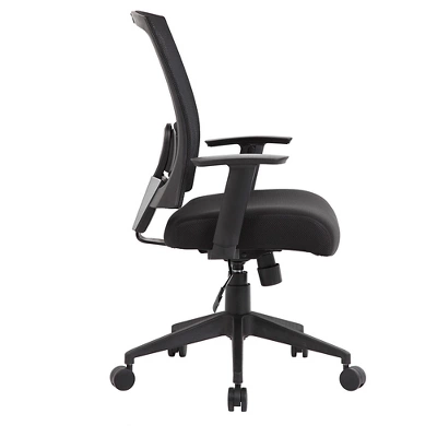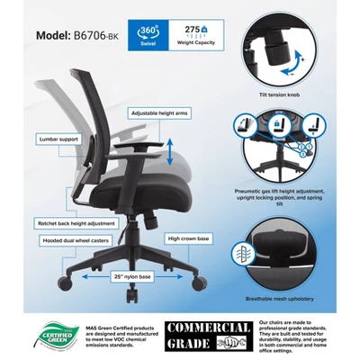 Our mesh back task chair provides comfort and ergonomic support for any office environment. It features ratchet back height adjustment, two adjustable height armrests, a pneumatic gas lift seat for easy height adjustment, and adjustable tilt tension control. Its versatility is augmented by a black mesh back with lumbar support and a breathable black mesh fabric seat. All of this is supported by a 25” black nylon high crown base and five hooded double wheel casters.