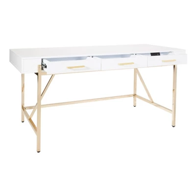 Create the chic workspace of your dreams with our beautiful Broadway desk by OSP Home Furnishings. This stunning high-gloss, white desk combines elegant warm gold detailing with attractive, classic lines for a fresh, modern and sophisticated feel. Designed perfectly for inspiring creativity and productivity all day long. Three ample storage drawers allow plenty of room for your pens, paper and other office supplies. Get the upscale home office you’ve been craving with the Broadway Desk.