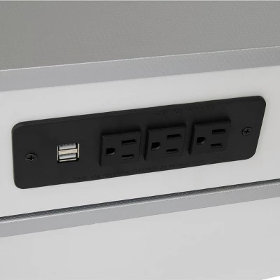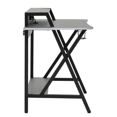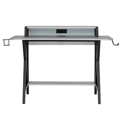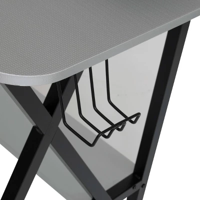 The Challenger Wide PC Gamer Computer Desk with Charging Station, Cup and Headphone Holder by SD Gaming features a large 47.5” w x 23.75” deep gaming surface with a simulated carbon fiber finish and a beveled front cutout that keeps you closer to the monitor without sacrificing room for your accessories. It also provides gamer specific features: a cup holder and headphone hook that save desktop space. This gaming table has a power console that provides 3- grounded outlet receptors and 2-USB charging ports to keep your accessories powered. The desktop also has a cord management hole with cover for organizing your electrical cords. The steel frame has a powder-coated finish that resists scratches and corrosion. The floor levelers and back panel provide stability. The bottom shelf provides extra storage for larger items.