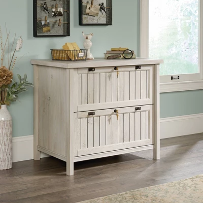 Expand your office storage and enhance your décor with this lateral file from the Costa collection. It features two easy gliding drawers that hold letter or legal size hanging files. Each drawer locks for secure storage of valuable papers and files. It also features a patented, interlocking safety mechanism that allows only one drawer to open at a time. Finished in Chalked Chestnut® and detailed with a framed, slat-front and 1″ thick tabletop, this cottage inspired lateral file will look stunning no matter where it stands.