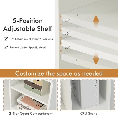 The multifunctional computer desk integrates a keyboard tray, a pull-out drawer and 2 tier open shelves for an orderly arrangement of your work supplies. What’s more, the upper shelf is adjustable in height for storing different items. And if you want to put the computer host aside, you can remove the upper shelf to make the bottom shelf a CPU stand. Besides, the spacious tabletop is equipped with a cable management hole for an overall tidy look. What’s also worth mentioning is that we attach great importance to details. For example, the non-scratch foot pads improve the stability and protect the floor, while the white stickers help cover the screw holes.