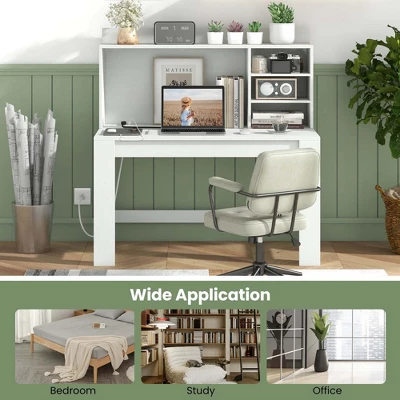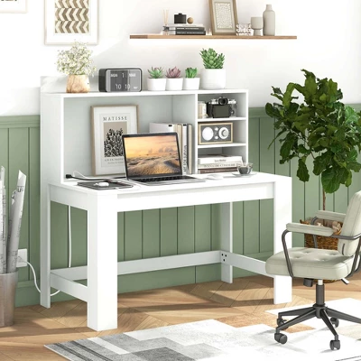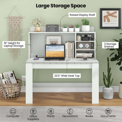 Are you looking for a versatile and stylish desk that offers both functionality and elegance? Look no further than our white office desk! Equipped with a 23.5″ wide desktop, raised display shelf, and 3 storage shelves, this modern desk provides ample space for your essentials like books, office supplies, plants, and decorations. Besides, featuring the built-in charging station with 2 power outlets, 1 USB, and 1 Type-c port, this study desk ensures a clutter-free workspace. Whether used as a computer desk in the office, or as a dressing table in the bedroom, its modern design will be a practical yet aesthetic complement. Sturdy L-shaped legs and H-shaped frames can support up to 330 LBS, making it a reliable and durable choice. The desk is equipped with non-slip foot pads for stability and a cable management hole hassle-free wire organization, while the easy-to-clean surface adds convenience to your daily routine.