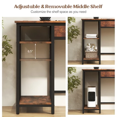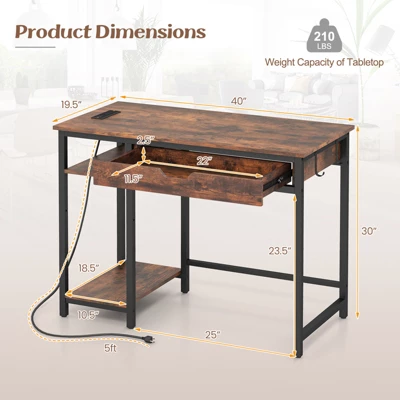 This industrial computer desk is a great addition to your living space. With built in power outlets, you can conveniently charge your phone, tablet or power bank. Its enriched storage space can keep everything organized without any mess. Spacious desktop and large drawer design help store your computer, laptop, mouse, favorite books, or notes for easy access. Adjustable and removable middle shelf allows you to customize the shelf space as you need. Also, 2 side hooks can hang headphones or bags. Constructed of anti-wear board and sturdy metal frame, this computer desk with drawer is built to last. More well-made details include the cut-out handle, smooth sliding rails, easy-to-clean surface. Compact size makes it fit well in your home office, study room, bedroom, or living room.
