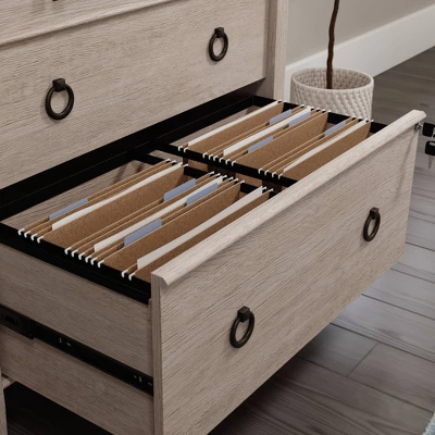 Bring simple timeless charm to any room in your home with this 2-drawer lateral file cabinet from the East Adara collection. The top surface of this lateral file cabinet is large enough for a lamp, your pile of mail, a printer, and home décor. The drawers of this 2-drawer filing cabinet have full extension slides for smooth ease of use and hold letter or legal-size hanging files. An interlocking safety mechanism only allows one drawer to open at a time, keeping you and your family safe. The bottom drawer of this legal-size filing cabinet includes a key lock for security of your most important documents. Finished on all sides for versatile placement, this lateral file will have a polished look no matter how you arrange it. An elegant Cascade Oak finish makes this office filing cabinet the regal addition you have been seeking for the home office, living room, or hallway.