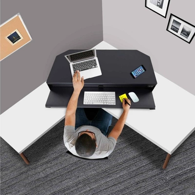 - SLEEK CORNER DESK: With its angled design, this desk converter fits perfectly into corners and is perfect for L-shaped desks. Hide all those unsightly cords with built-in cord management