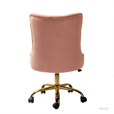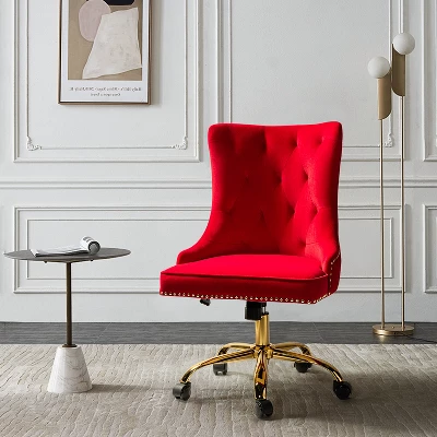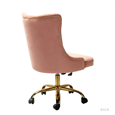 Add a touch of contemporary elegance to your space with a design that is equally functional and stylish. This modern swivel office chair is a wonderful addition to any office or home office with its variety vibrant colors-velvet fabric upholstery that blends with any design taste. With an armless, wide seat, this chair will become the most comfortable chair in your home or office. Designed in a chic style with luxury modest nailhead trim, tufting and piped edges lend a tailored touch, while foam fill offers comfort and support. The chair’s base includes a swivel mechanism, tilt angle adjustable, and a lever-operated lift to adjust the seat height and angle. Sturdy and durable metal base and 360-degree wheels allow you to glide to anywhere in the room, height-adjustable to tailor your professional space. The cute task chair is ideal for any casual or professional working area. It provides comfortable support with a cozy and convenient design.Item Size: 22.5″Wx25″Dx35.5-38.5″HSeat size: 22.5″Wx19″Dx18.5-21.5″H