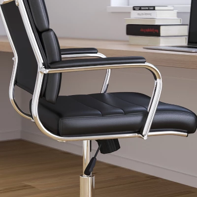 Absolute in every degree, this ultra contemporary office desk chair presents all the qualities of modern design accentuated by new age functionality. A chic three panel high-back seat is thoughtfully upholstered, completing the naturally ergonomic design. Pneumatic seat height adjustment, tilt/tension knob and 360° swivel provide ample freedom of movement, while the chrome base is fitted with dual wheel casters to protect flooring surfaces. Find your vibe and settle in with this new age office chair.