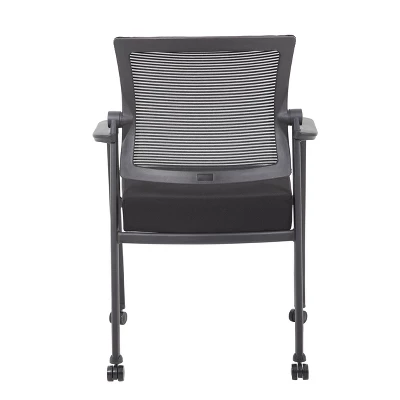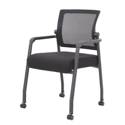 The mesh guest chair with casters, in black, is the perfect addition to any room or office. The chair is at a fixed height with fixed arms and is designed with an upholstered seat and a breathable, airy mesh back. It has a steel tubular frame with hooded double wheel casters that allow smooth movement across many flooring surfaces. The black chair adds a modern, professional appearance to any space and has a weight limit of 275 lbs.