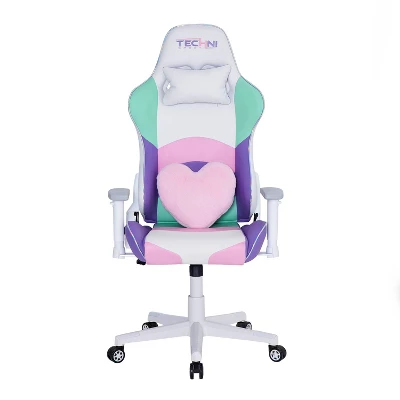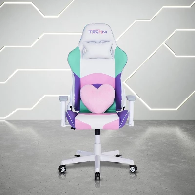 Techni Sport Kawaii Gaming Chair is a collection of high end racing-style chairs designed for gamers. This chair made with high quality PU, memory-foam is a reclining gaming chair built with ergonomic comfort in mind. The iridescent trim outlining the seat enhances your gaming experience. With an extendable support, contoured segmented padding, high back, plus adjustable neck pillow and heart shaped lumbar support cushion gives you the kawaii style. Additional features include pneumatic seat height adjustment and 2D padded white armrests, 150 degree reclining mechanism and tilt with tension control mechanism provides high-performance comfort used during intense gaming sessions. The striking accents complete the modern, high-quality look and feel, while 5-star durable white nylon base and non-marking casters assures your stability with mobility. This durable gaming chair supports 250lbs. weight capacity and is backed by 2 year Limited warranty.