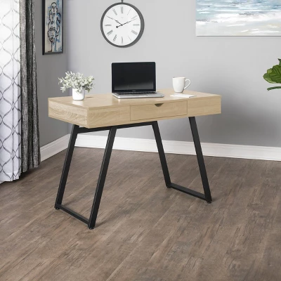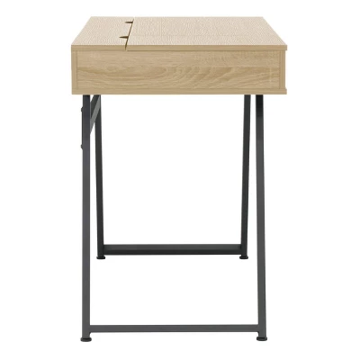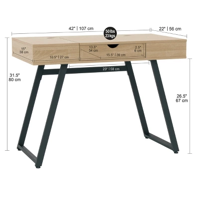 The perfect combination of modern style and functional features, the Rockdale Laptop Multi-Compartment Laptop Desk with Charging Station offers storage solutions and a built-in power supply strip to keep your laptop, phone, and other accessories charged. Designed for small spaces, this office desk has a drawer and tops that lift so you can store items to clear your workspace. The hinges on these storage compartments are soft-close for safety. Cord management holes allow you to organize and run your power cords to the USB and 3-prong power outlets in the back compartment. Cutouts on the lifting tops make them easy to maneuver. The powder-coated metal and durable vinyl laminate tops are scratch-resistant. Ideal as a standard writing desk or laptop computer, this desk is available in Honey Maple or Shorecrest gray.