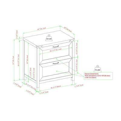 - Weight capacities: Top surface 125 lbs., drawers 15 lbs. each
