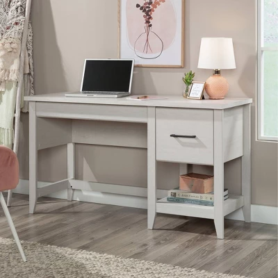 Create your grocery list, work from home, or finally write that novel on your new single pedestal desk from the Summit Station® collection. This home office desk with drawers offers a spacious top surface that provides you with the space you need for office items like your laptop, stacks of notepads, folders and your hot cup of coffee. This pedestal desk features two drawers that open and close on smooth metal runners. The file drawer of this desk holds letter-size hanging files for easy access to your most important documents. The lower open shelf provides you with additional storage space for miscellaneous items like organizing bins and home décor. A pencil drawer beneath the top surface gives your wood office desk convenient space for your planner, pens, and even your laptop. A desk-top grommet hole for electrical cord access keeps your home office free of cord clutter and a strong and lightweight panel construction makes it easy to assemble and rearrange. Finished on all sides for versatile placement, this home office desk with open storage will look polished from every angle with tapered feet and chamfered edges. Finished in Glacier Oak™, this small office desk is everything you need and more.